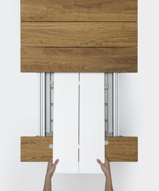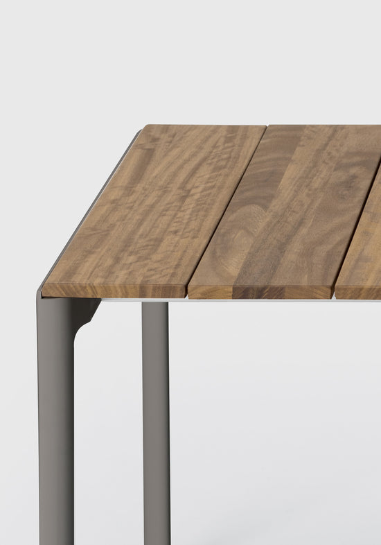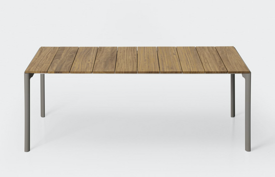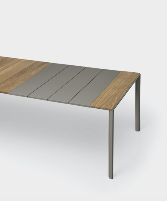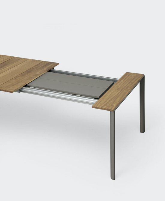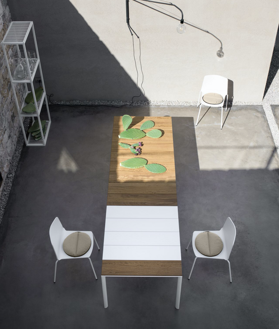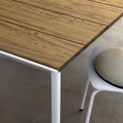 With their rounded shapes, the legs of Maki tables are combined with a staved top made of Teak, FSC certified to respect the environment, which is 20 cm wide and 2 cm thick. The top can be left in its natural colour, since over time it acquires an unmistakable silvery shade, or it can be treated with oil to allow it to resume its original colour. Extendable tables are fitted with drawn aluminium extensions, housed in a special compartment.