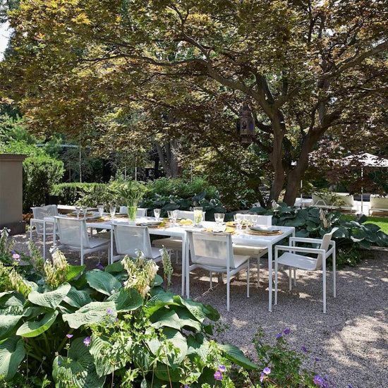 Richard Schultz's outdoor dining chairs have been setting the scene for modern meals outdoors for over 50 years. The aluminum frame makes them resilient to weather and wind, while the signature mesh back keeps you cool.