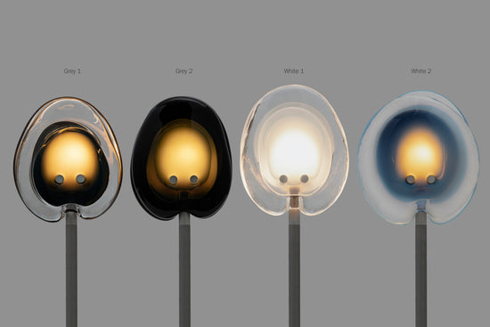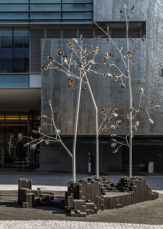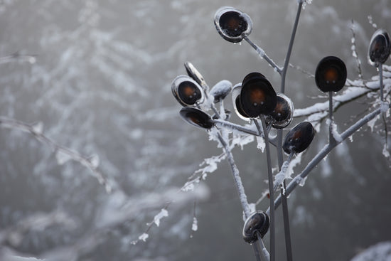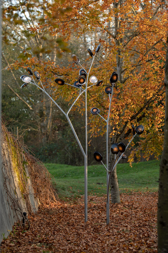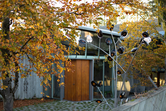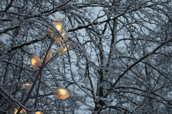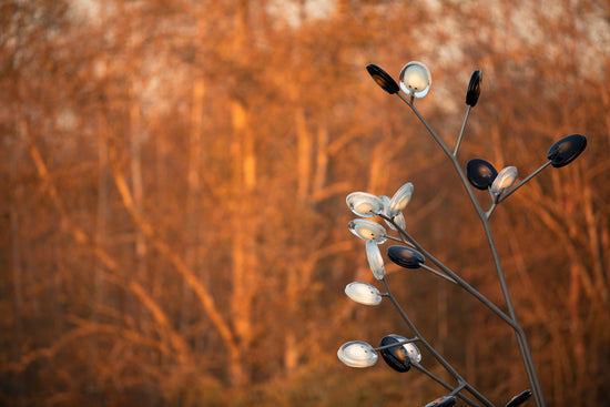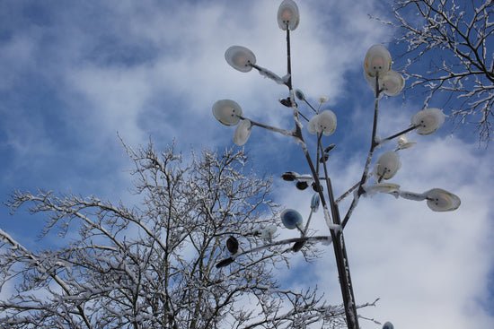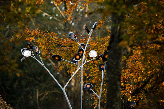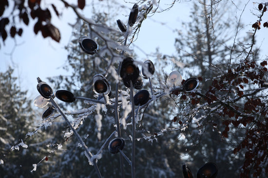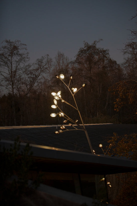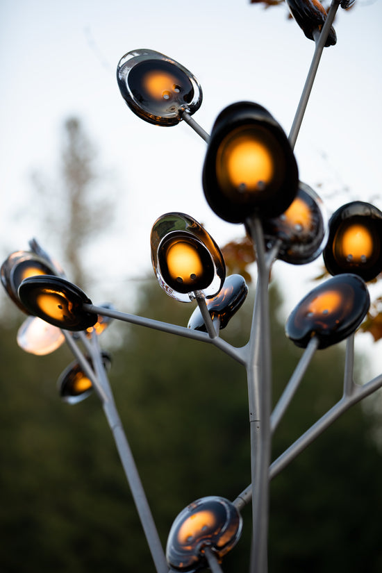 A bead blasted steel armature system connects the glass pieces to a series of branches and stems. Each armature segment carries low-voltage electricity and diverges into 2-4 separate branches, allowing an infinite variety of possible forms.
