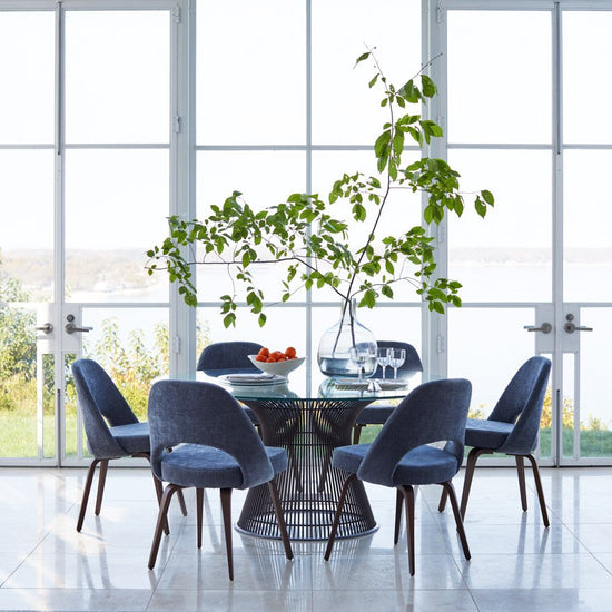 In 1966, the Platner Collection captured the “decorative, gentle, graceful” shapes that were beginning to infiltrate the modern vocabulary. The iconic dining table, which creates a focal point for any dining room, is created by welding curved steel rods to circular frames, simultaneously serving as structure and ornament.