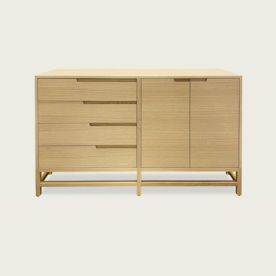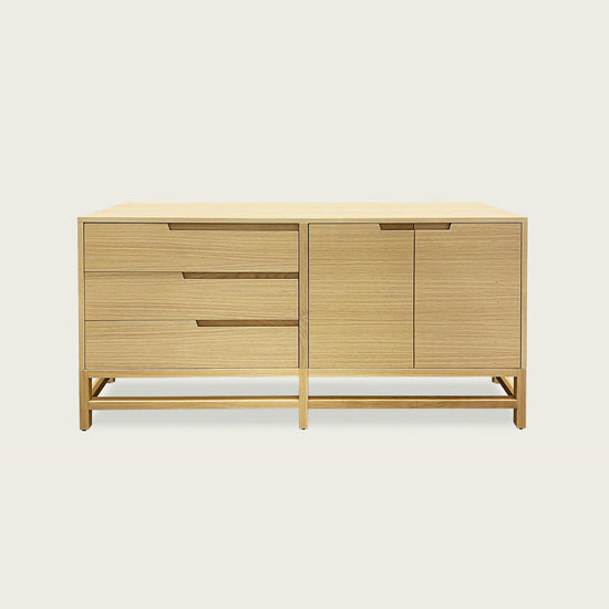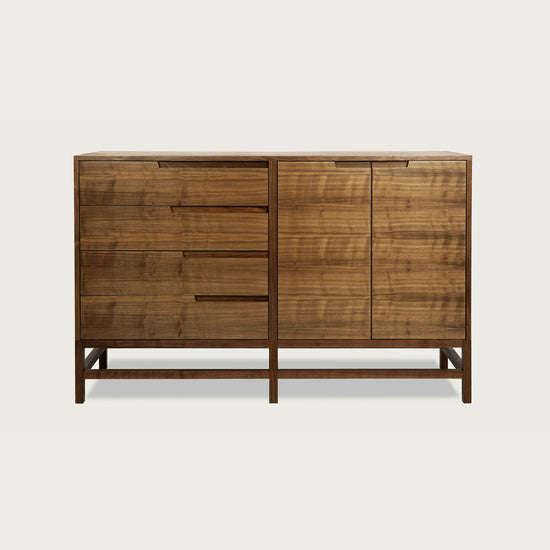 The strong linear detailing of this design family gave rise to the name Linea. Beautiful quarter-sawn veneer is carefully chosen for the paneling, which is accented by the distinct horizontal and vertical elements of the solid wood base. The intriguing diagonal edge-detailing on the inset handles adds the final touch to this elegant design.