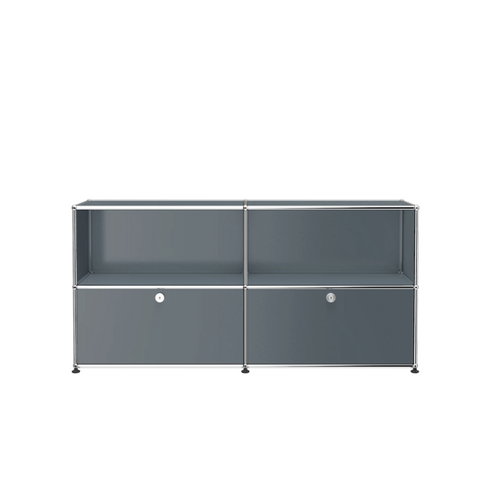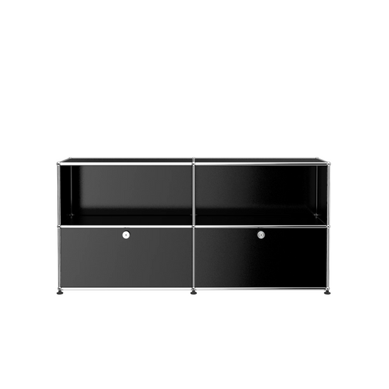 A functional storage credenza with an open top section and two drop-down doors on the bottom that lock with the twist of a coin. Available in 14 standard surface colours.