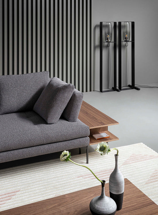The aerial, fabric-covered frame matches the cushions and backrests in various sizes, creating a visually light, yet restrained ensemble. The lightness of the ensemble is further emphasized by the slender, minimal shape of the metal foot, available in different colours. Thanks to its versatile elements, the collection assumes different, interesting configurations for a living area with a focus on customization.