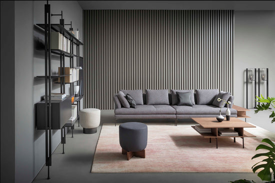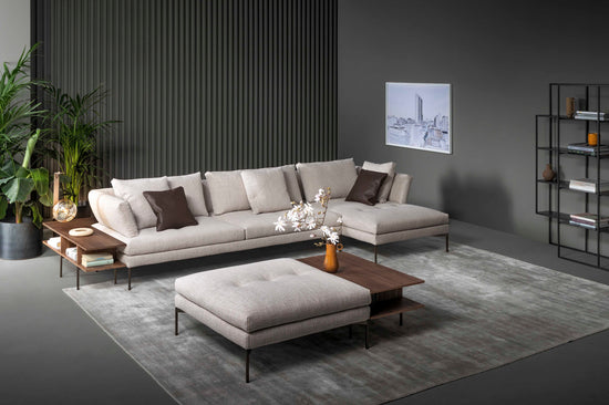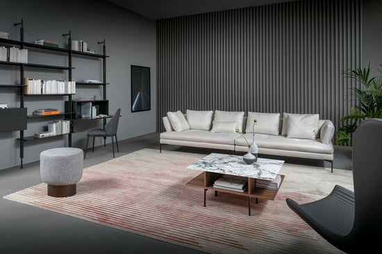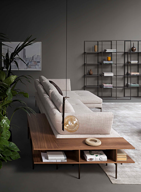The system is completed by the Aliante side tables, available in Canaletto walnut or with a ceramic top and made in different shapes and sizes, accessories that play with the space when positioned laterally, in front of the sofa or between two elements of the composition.