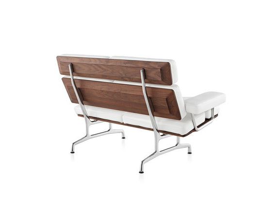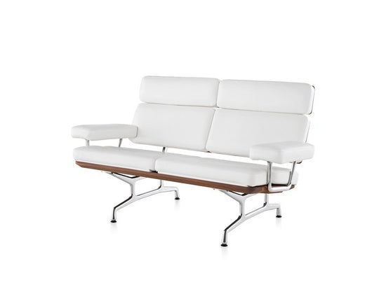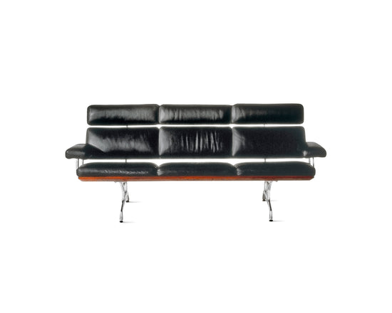 One of the last pieces of furniture from the Eames office, the Eames Sofa (1967) was designed to be a low-profile piece of furniture that would fit in the tightest of living spaces. This modern three-seat leather sofa features a solid wood back and frame panels finished with gunstock oil. Polished aluminum legs and arm supports complement cushions expertly upholstered in luxurious black leather. A rarity among sofas, this authentic Eames couch by Herman Miller has been in production since 1984.