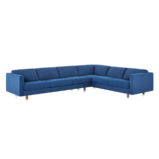 The sofa group offers a beautiful proportion with a sit height of 15" and a depth of 23.5". The pieces also feature a depth pitch of 1.25", contributing to the overall feel of lounging and relaxation. The rounded wooden legs offer a quiet, yet contrasting element at 4" in height, and are available in walnut and white oak finishes.