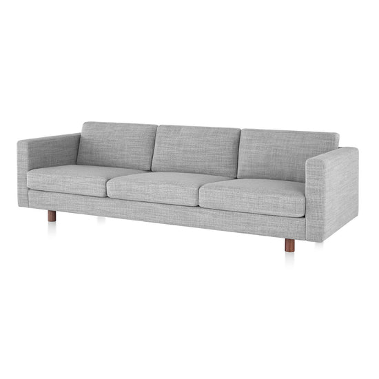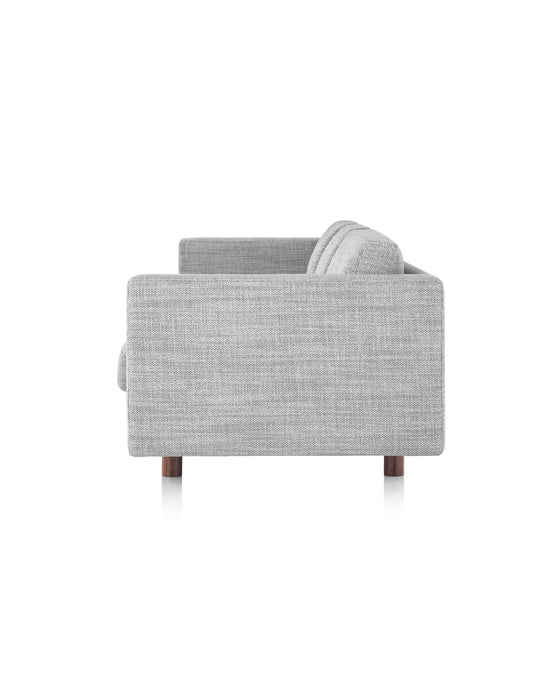 The sofa group offers a beautiful proportion with a sit height of 15" and a depth of 23.5". The pieces also feature a depth pitch of 1.25", contributing to the overall feel of lounging and relaxation. The rounded wooden legs offer a quiet, yet contrasting element at 4" in height, and are available in walnut and white oak finishes.