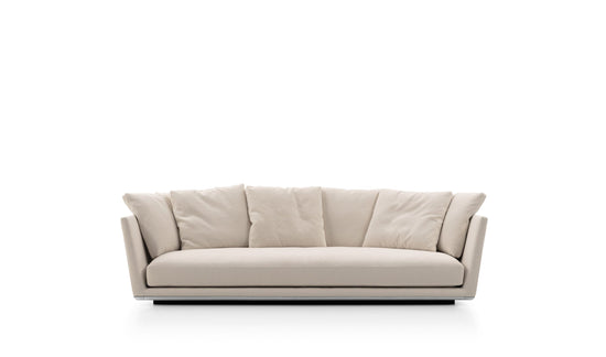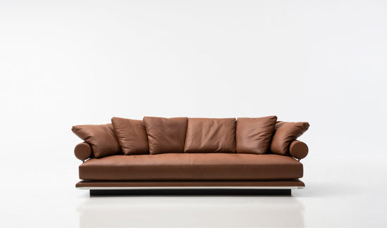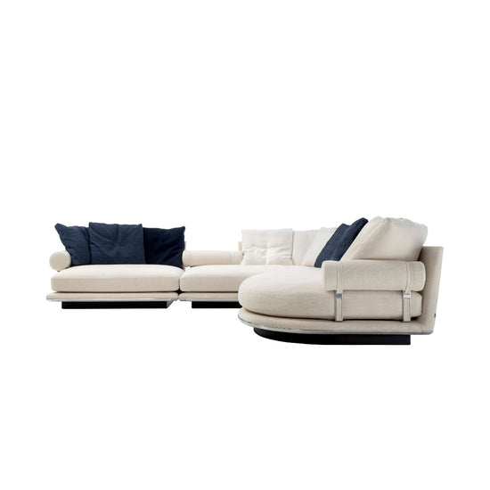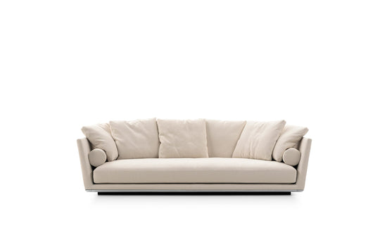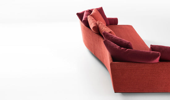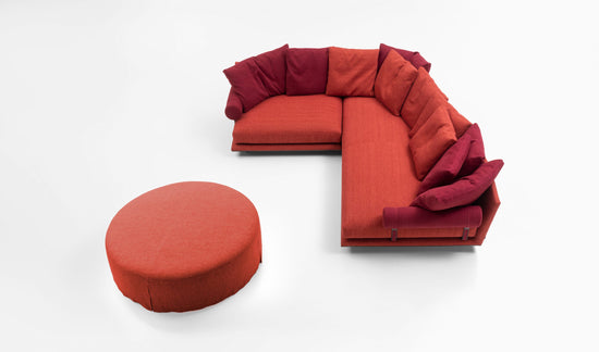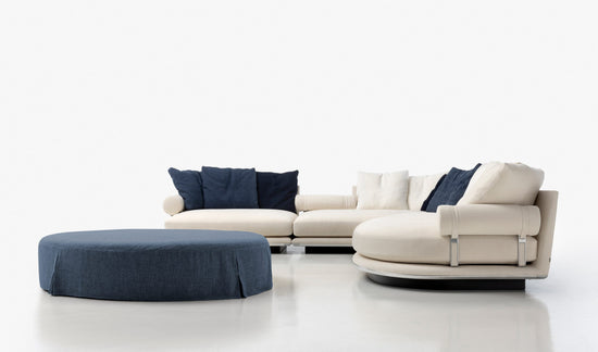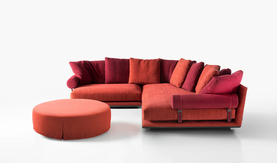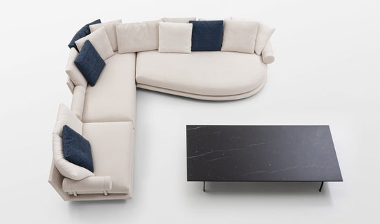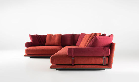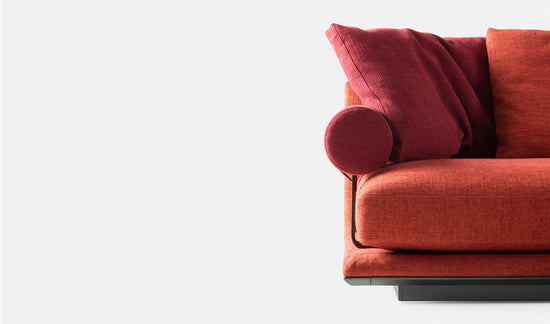 Noonu is a system of upholstery in which large sizes meet impressive flexibility. The supporting structure disappears from view, creating “islands” which appear to almost float, suspended in mid-air. The seats themselves are deep, with a single, large seat cushion that guarantees extreme comfort, inviting and relaxing whilst also characterising the overall aesthetic. The tilted back is designed to accommodate cushions, which can be distributed however you wish. The design is made even more intriguing by a support element that can be arranged in any manner of positions: a roller cushion bound by sophisticated webbing to a die-cast aluminium frame, which sits beneath the seat cushion. This allows you to use it freely as a terminal armrest element or as a headrest, to read or to work, placed between the seats or removed entirely, depending on how the sofa is being used.