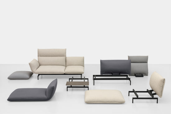 Designed by Luca Nichetto, Tenso is a system comprising padded items inspired by tensile structures. The core of the system is its frame, a light and sturdy tubular structure to which the various elements are fixed – seats, backrests, cushions and tabletops, between which a tension is created that keeps the various parts suspended and open, like a welcoming embrace.
