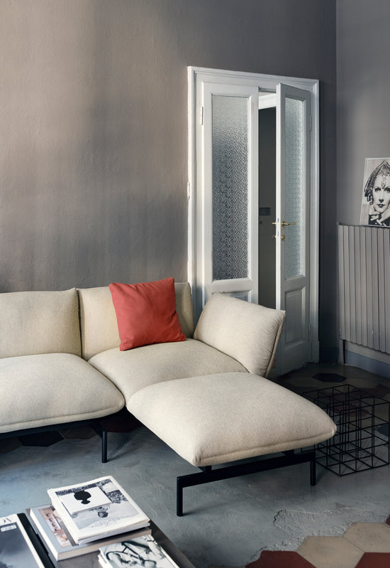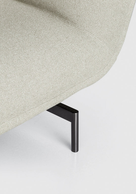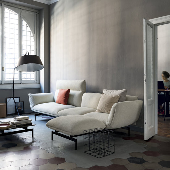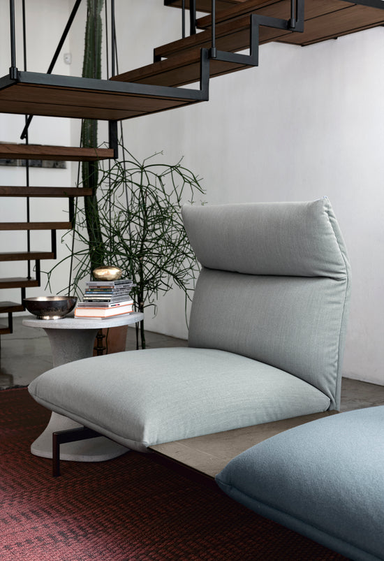 The padded items, which can be combined as required to create sofas, sofas with a peninsula element or a pouf, also with built-in tabletops, are soft and comfortable, whereas the upholstery in fabric or leather features tailored details. The element with a reclining headrest offers extra comfort to those who love reading or watching TV.