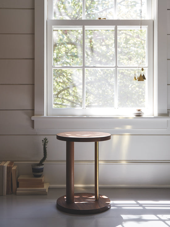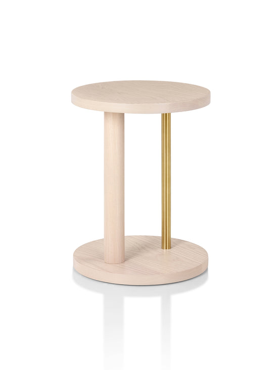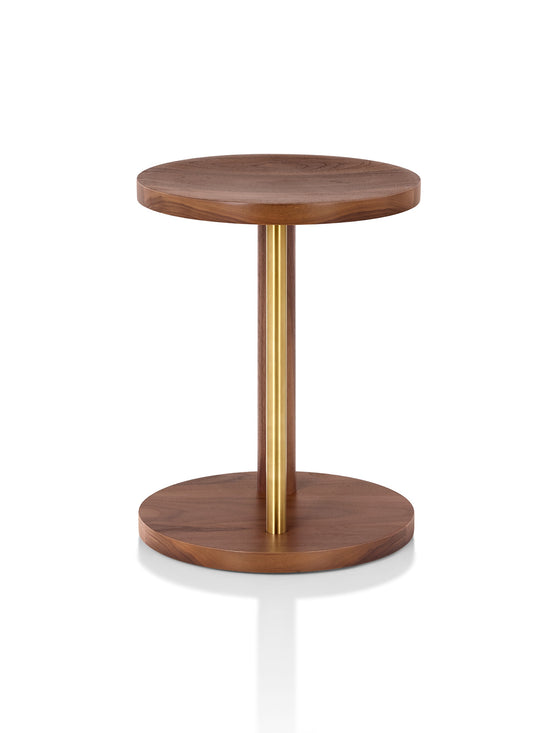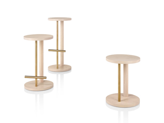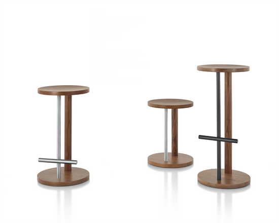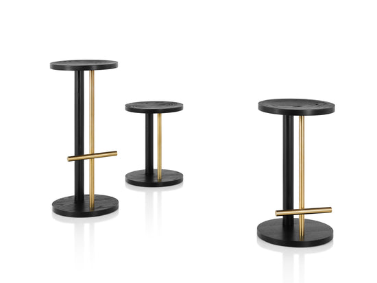 Two parallel legs join the circular seat and base together in the kindred pairing of metal and wood. Offered in three heights, with the two tallest outfitted with a crossbar footrest, Spot Stools bring an austere sense of elegance to any interior.