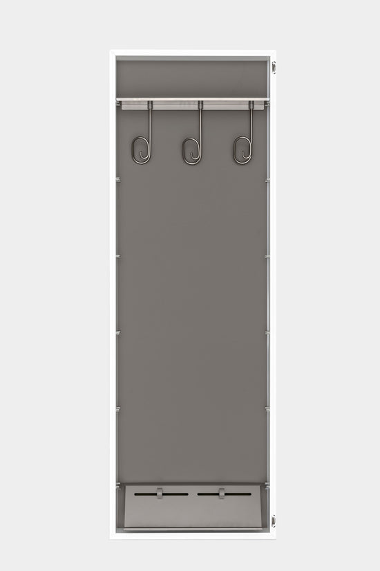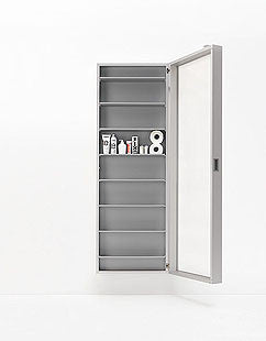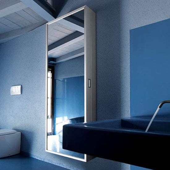 Box is a simple multifunctional wall cabinet. The result of the creative talent of Luciano Bertoncini, it features minimalist aesthetic appeal and great versatility for use. The frame, in light hardwearing aluminium, frames a mirror door that conceals multipurpose shelves, clothes hooks and shoe racks.