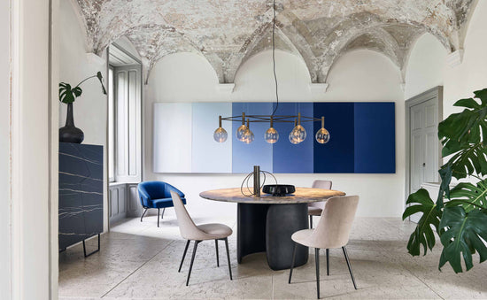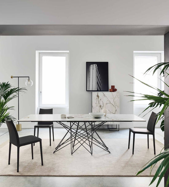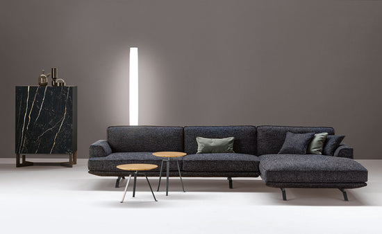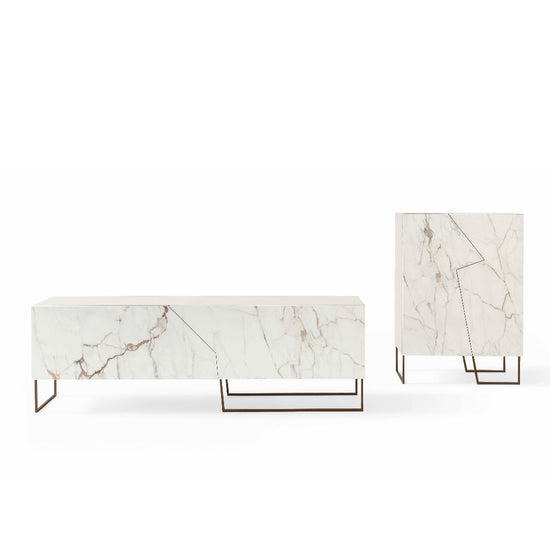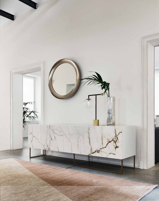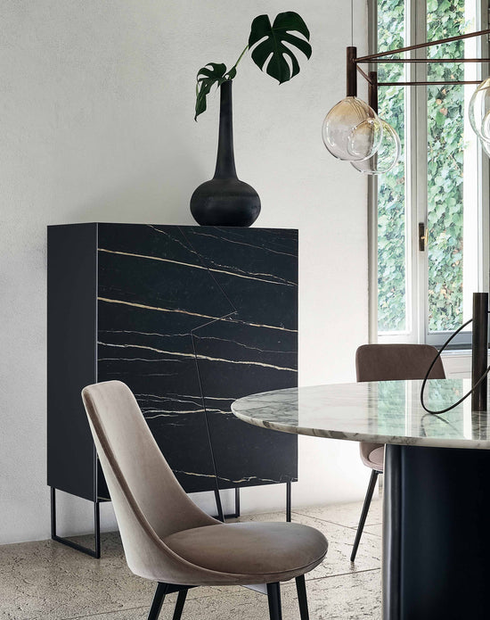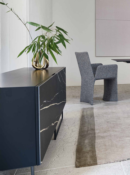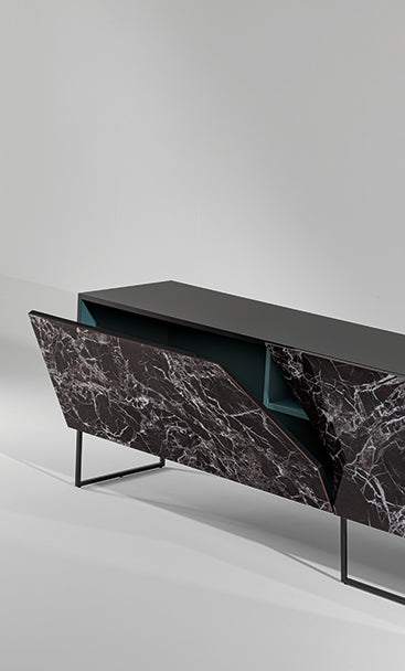 By applying geometry to matter, the Doppler K sideboard Sideboard stands out for its marked scenographic charge, which can characterize any environment and interior style design. Almost suspended on the linear metal base, the volume container, in lacquered wood, is characterized by the coating of the ceramic doors.
