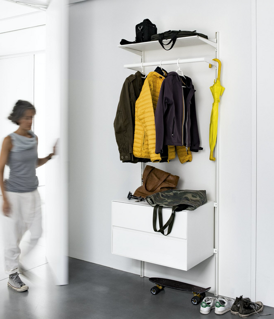 Accessories such as side panels, bookends, lighting tubes, clothes hooks and wall storage units provide many other options for use: from the living room, where Dot is a minimalist bookcase that almost disappears, to the kitchen, the home office corner, the wardrobe and the closet at the entrance. This versatile design project helps you organize every room in the home, as you desire.