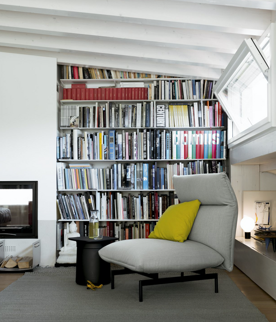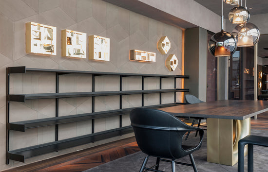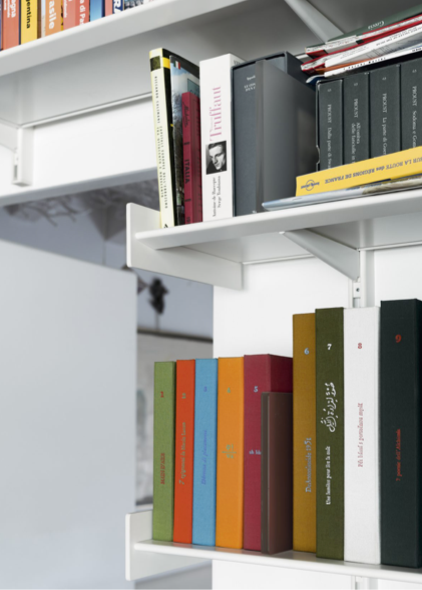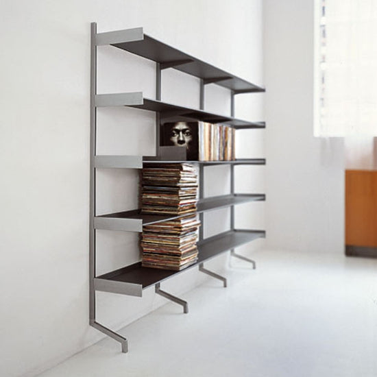Dot is a versatile system designed to furnish any space in the home, a light design element consisting of a few simple components that can lead to a multitude of solutions. It comprises narrow painted sheet metal shelves and light extruded anodized aluminium uprights, available in six different sizes or custom-made.