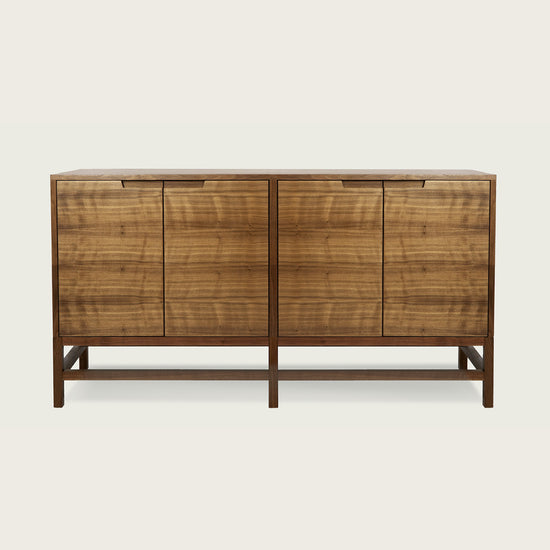 The strong linear detailing of this design family gave rise to the name Linea. Beautiful quarter-sawn veneer is carefully chosen for the paneling, which is accented by the distinct horizontal and vertical elements of the solid wood base. The intriguing diagonal edge-detailing on the inset handles adds the final touch to this elegant design. A complementary design to the Linea Dresser, Linea Sideboard, and Linea Console.