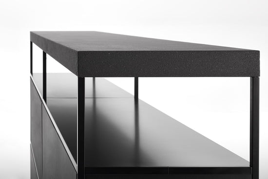 - Available with 5 cm thick top shelf, made in multiply wood covered in reconstructed white Carrara marble, reconstructed Ebony black marble and Italian walnut fine wood. The material top shelf in Italian walnut is not available for compositions longer than L300 cm.
