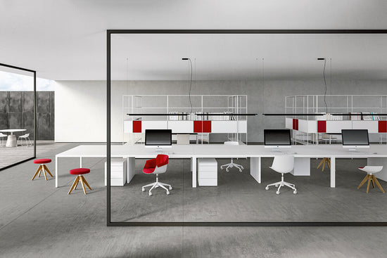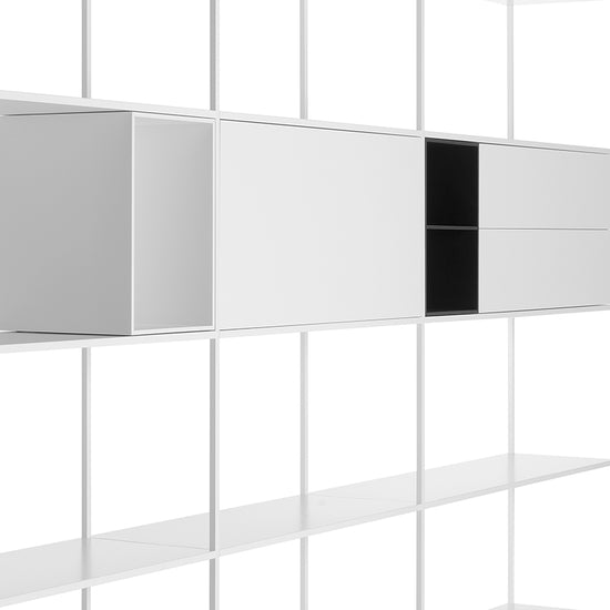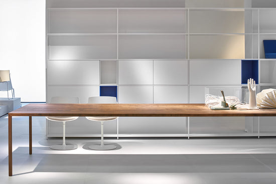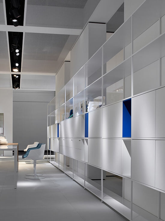 The considerable span of the shelf in extruded aluminium combined with the joining system, have allowed to develop the system in length, making it modern and adjustable to any kind of environment. Modular and flexible even thanks to the new kinds of storage units. This can be with flap opening doors or drawers. They are simply resting inside the structure and are repositionable quite easily, thus allowing to meet any storage requirements as desired.
