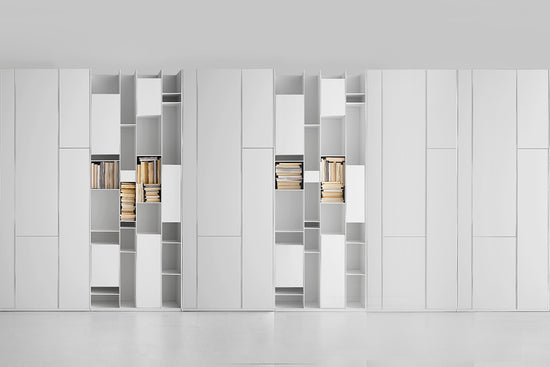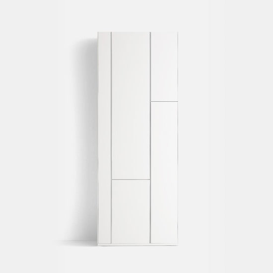 Made of medium-density wood fibreboards, in micro goffered white lacquer. Uprights and shelves in thickness 6mm; doors in thickness 12mm. The back is made from white melamine coated board (thickness 10 mm).