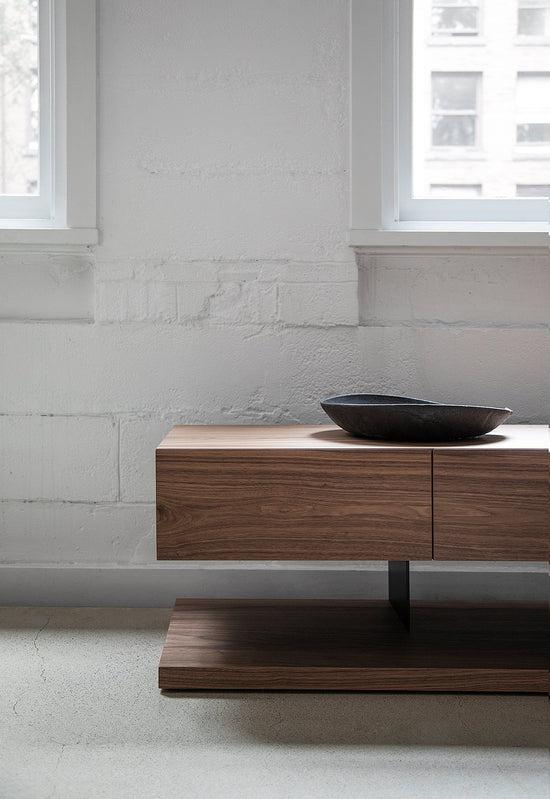 Cable management and considerable open storage space makes the Standard console well suited for media components. Standard is offered in white oak or walnut wood veneer.