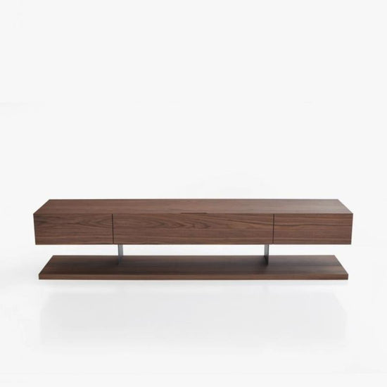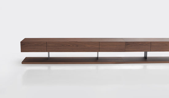 A console with two drawers, a centre flip-down door, and a platform base. A supporting fin separates the base from the body and makes for flexible storage with a weightless appearance.