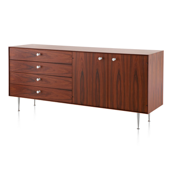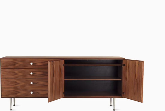 Along with looking and feeling exquisite, the richly veneered buffet also offers a high degree of utility. With 2 adjustable shelves behind its hinged doors and 4 deep drawers, it generously allows for the storage of objects in an efficient, organized manner. Available in a variety of beautiful and sustainable wood veneers, it complements both casual and elegant environments.