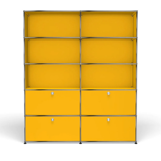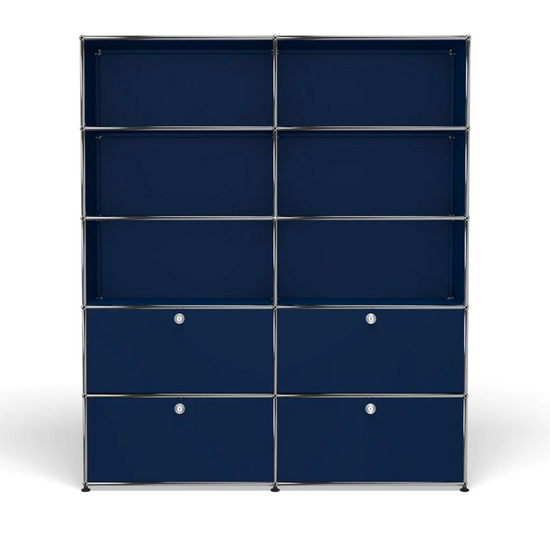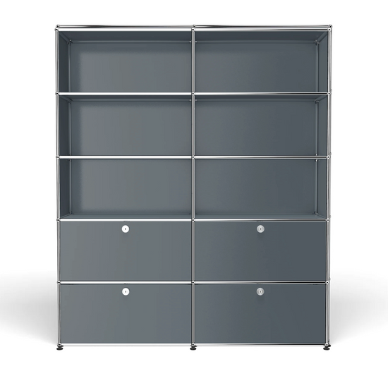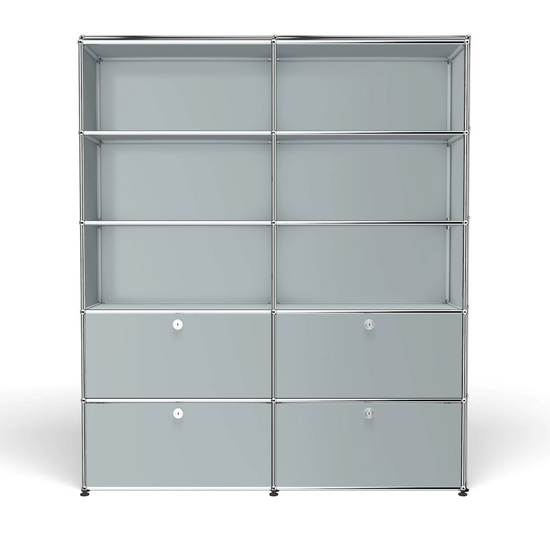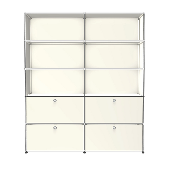 Storage and shelving with two drop-down doors and two bottom drawers. Available in 14 standard surface colours.