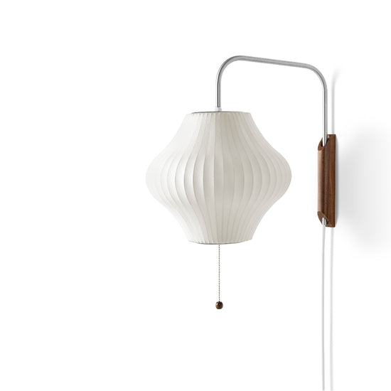 The Nelson Pear Wall Sconce features a 2-inch-thick, solid walnut wall-mount, a steel arm that extends out, and a 12-foot plug-in cord. A swivel hinge in the arm allows for easy height adjustments.