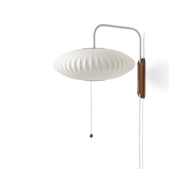 The Nelson Saucer Wall Sconce comes with a solid walnut wall-mount and a steel arm, and 12-foot plug-in cord. Its design allows one to adjust the sconce from left to right, and up and down, without needing to reposition it on the wall.