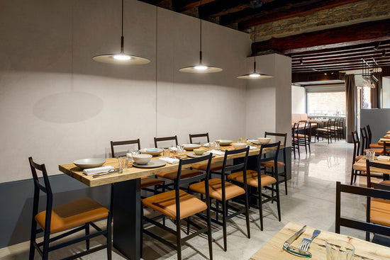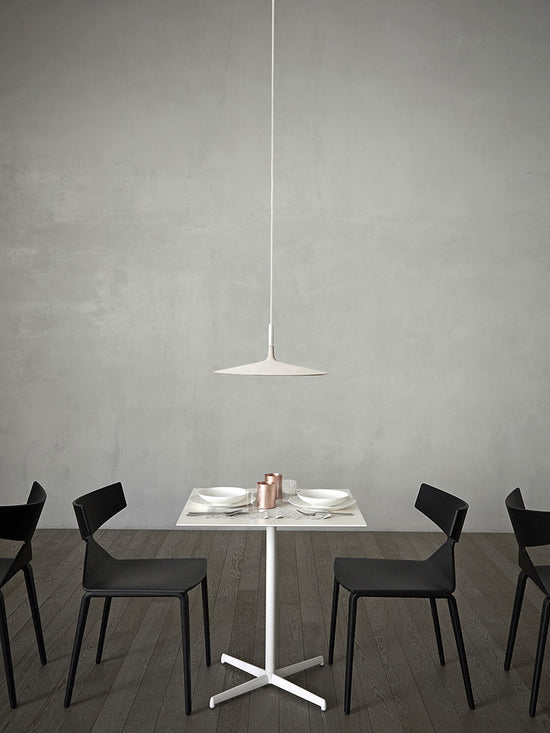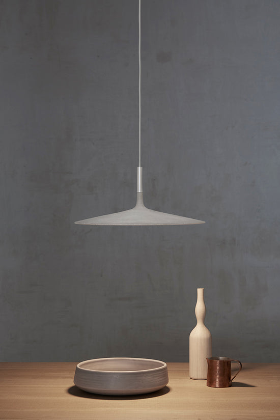 A special, exclusively formulated concrete plays the starring role in the Aplomb lamps. The especially large and slimline design of the Aplomb Large suspension lamp diffuses a broad beam of light.