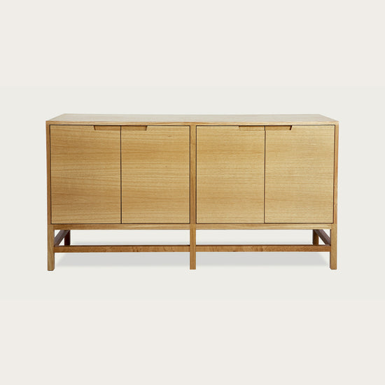 The strong linear detailing of this design family gave rise to the name Linea. Beautiful quarter-sawn veneer is carefully chosen for the paneling, which is accented by the distinct horizontal and vertical elements of the solid wood base. The intriguing diagonal edge-detailing on the inset handles adds the final touch to this elegant design. A complementary design to the Linea Dresser, Linea Sideboard, and Linea Console.