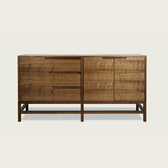 The strong linear detailing of this design family gave rise to the name Linea. Beautiful quarter-sawn veneer is carefully chosen for the paneling, which is accented by the distinct horizontal and vertical elements of the solid wood base. The intriguing diagonal edge-detailing on the inset handles adds the final touch to this elegant design.