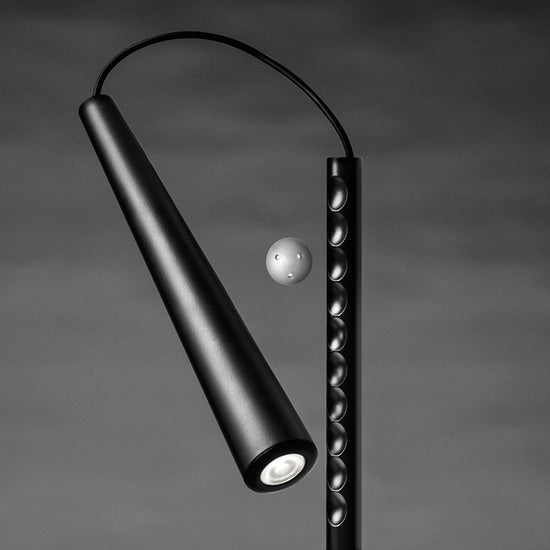 In the Magneto floor lamp, the invisible force of a magnet joins the supporting rod to the illuminating body, allowing you to direct it just like a torch, casting the light in the desired direction.
