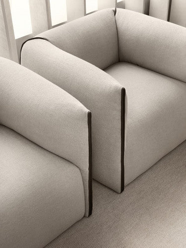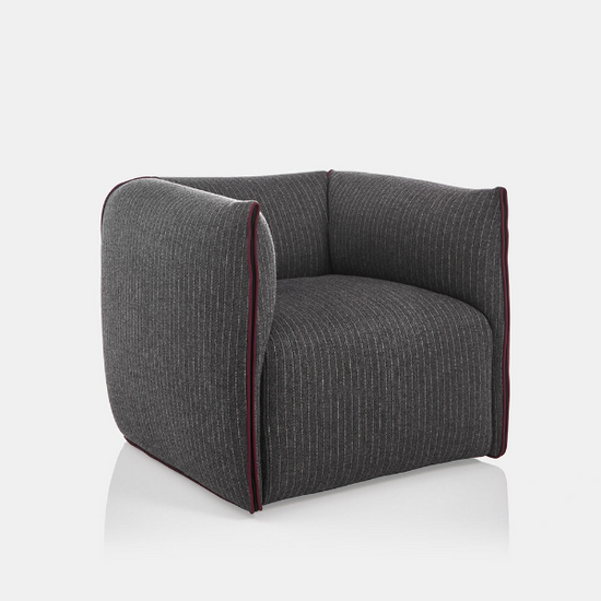 The Mia collection is characterized by an extrathick decorative trim which emphasizes its sinuosity by tracing its edges and intersections. The trim can be in the same tone of the cover, or in a contrast colour based on the customers’ choice. The fabric cover embraces the entire product and is tailored to enhance its shape and softness.