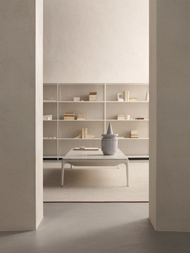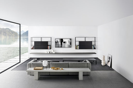 Minima 3.0: three stands for the three key elements that compose the system: shelf, frame, cabinets. Essential and flexible, Minima 3.0 represents the natural makeover of Minima, MDF Italia collection’s icon product, special mention at the XVII Compasso D’Oro ADI in 1998. Technology and innovation have enabled this thin aluminium structure, to propose an increasingly minimal yet strong identity. The storage units (with flap opening door, drawers, or open) are simply resting inside the structure and are repositionable quite easily. Uprights and shelves made of matt lacquered white and graphite grey extruded aluminium (100% recyclable). Nominal lengths of cabinets: 30, 60, 90 cm, available in a matt lacquered micro-goffered finish or in a wood variant. Two options: ground-resting (in 8 heights) or hanging (in 4 heights), always with a 33 cm depth.