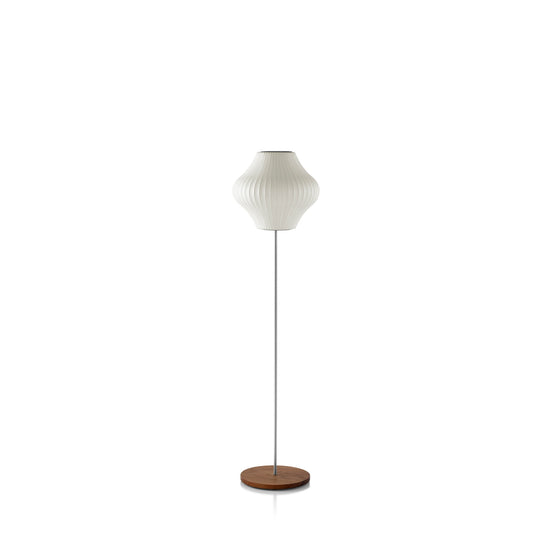George Nelson’s 1952 Bubble Lamp silhouette paired with a Lotus Floor base. The translucent shade creates soft, ambient light; choose brushed‑nickel base only or add a walnut cover.