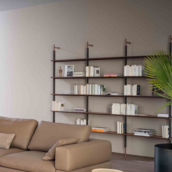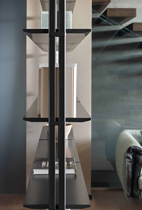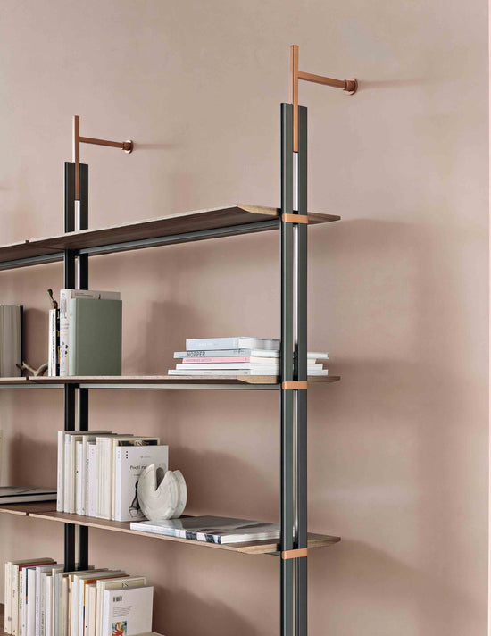 Mounting it to the wall takes place by means of supports composed of metal tubes with lead finish; both the shelves and the details that come out of the metal tubes are available in the same finish as the supports or in different finishes, for a play of contrasts of utmost elegance. The modularity of the Roll bookcase makes it suitable for any size wall, both in the home or office.