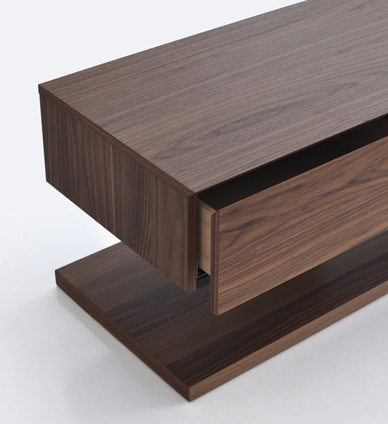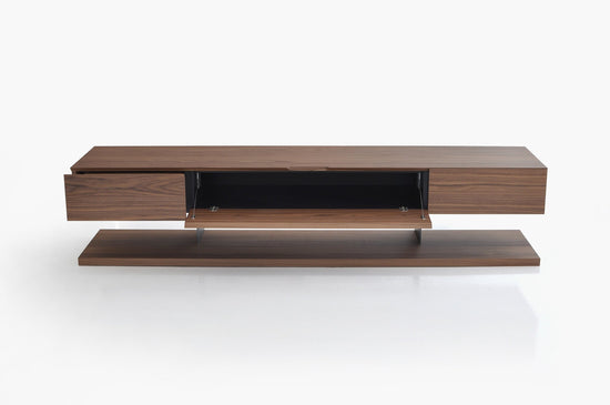 A console with two drawers, a centre flip-down door, and a platform base. A supporting fin separates the base from the body and makes for flexible storage with a weightless appearance.