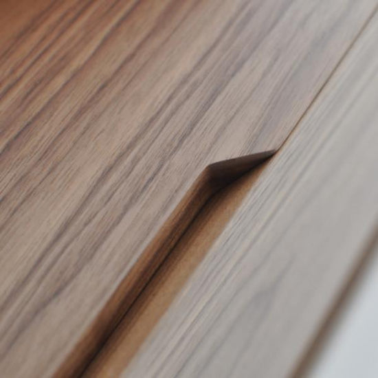 Solid wood edging and a mitred top edge allow for a sleek handle detail for the centre door while the side drawers are opened from below and feature soft close hardware. The face of the unit is made of a single veneered panel ensuring pattern matching. The supporting fin is produced from steel plate then finished in a heat-cured paint. Each base comes with imbedded levellers allowing for a perfect fit on any floor.