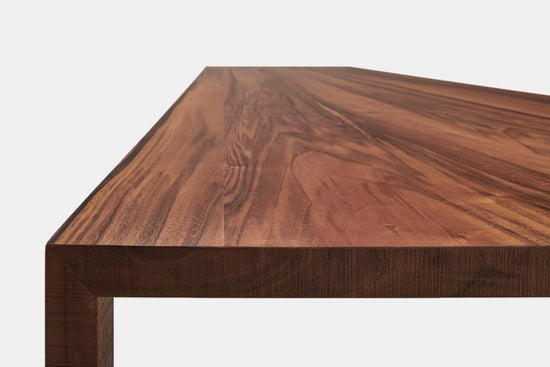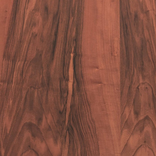 Solid Italian walnut, 2 mm thickness, obtained from sustainable forests and finely sanded into variously sized slats. This type of processing technique enhances the natural characteristics of the wood, granting the material different shades. Any visible design irregularities should be regarded as signs of quality and authenticity. Transparent acrylic finish. The edges and legs are covered in 2 mm-thick cut walnut, processed with a sawed effect (series of irregular cuts of different depths).