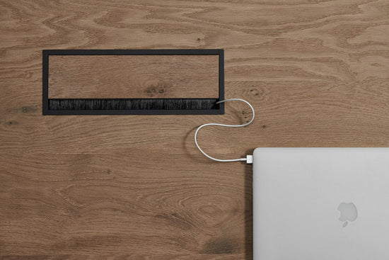 The tables are also available in the version equipped with 1 or 2 top-access and under top cable try. The top-access, in size 127x350 mm, is in aluminium and is available in three versions: single lead with soft closing, double lead and optional, single lead with soft closing, with inlay in the same finish of the table. Matt black lacquered top-access finish. It is also available in the same finish of the table, only for the stone and wood versions, only for the single lead and only for the heights H73, H90 and H110.