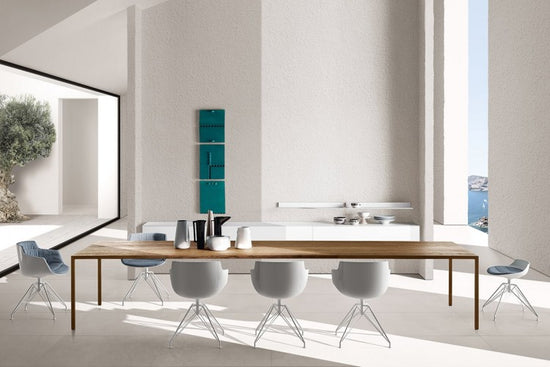 “A smart beauty, resulting from a thought and a know-how capable of transmitting a deep emotion through a wise accentuation of the peculiarities of the materials used”. Piergiorgio Cazzaniga describes in this way Tense Material, a collection of tables available in 5 heights and 36 sizes, capable of achieving large dimensions, up to 4 meter long, always keeping a perfect top tension.