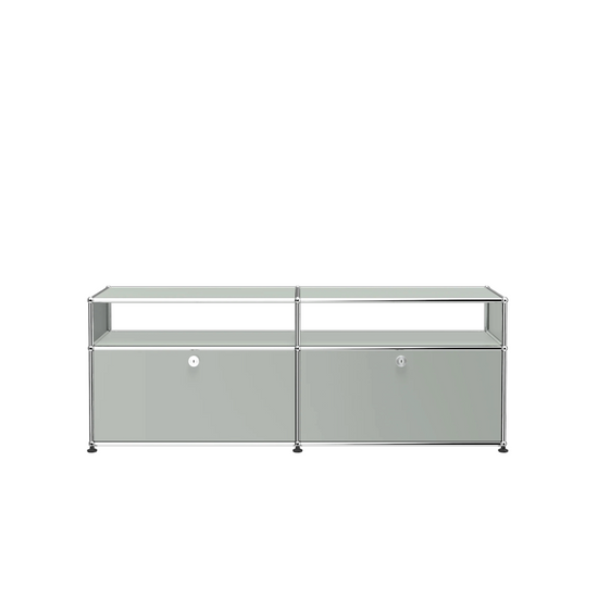 Media storage credenza with two drop-down doors that lock with the twist of a coin. Fitted with one cable cutout. Available in 14 standard surface colours.