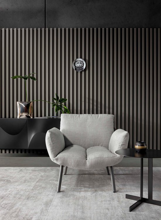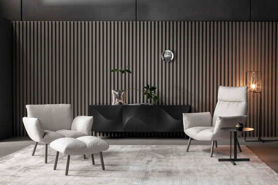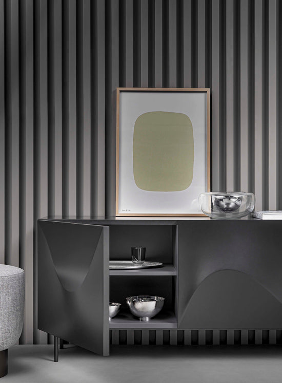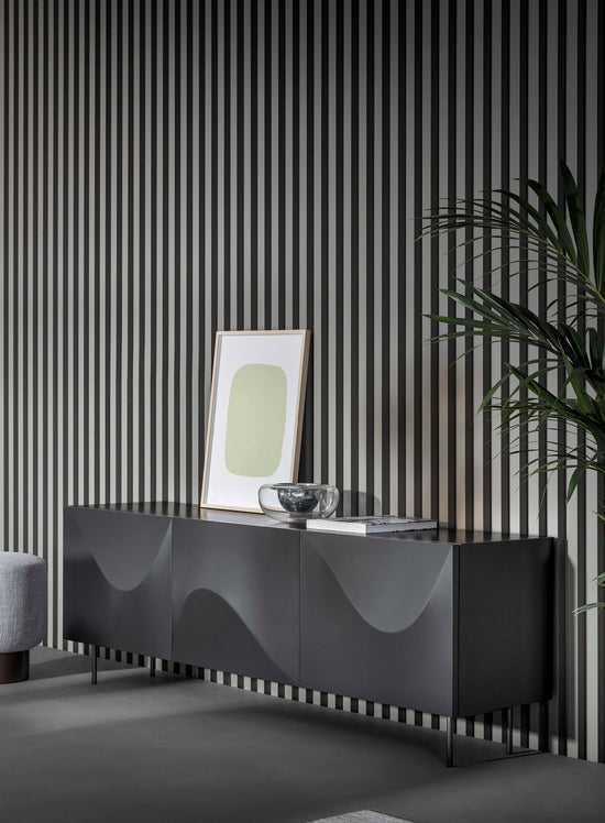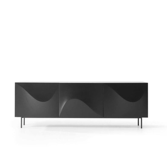 Inspired by the poster for Alfred Hitchcock’s film of the same name, the Vertigo sideboard is distinguished by the soft wave that characterizes the front doors, creating a flow of movement on the surface that softens the rigorous design of the unit. The metal base consists of four seemingly slender feet that give the entire unit a sense of lightness.